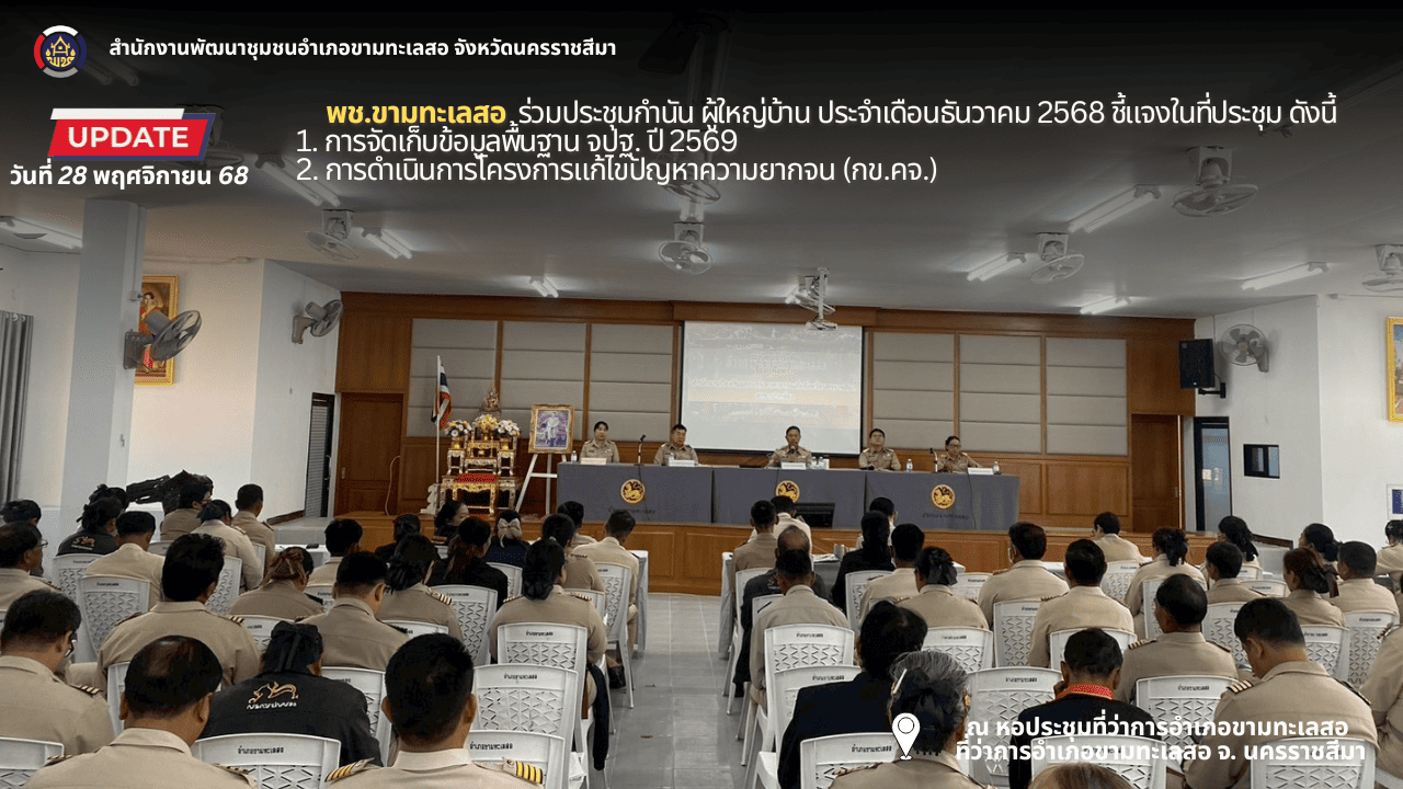 นายสมภพ มุกดาสนิท นายอำเภอขามทะเลสอ เป็นประธานการประชุมกำนัน ผู้ใหญ่บ้าน ประจำเดือนธันวาคม 2568 โดยได้แจ้งข้อราชการ ข้อสั่งการ และนโยบายของท่านผู้ว่าราชการจังหวัดนครราชสีมา