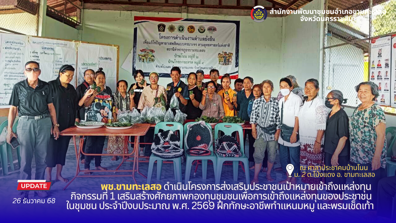 พช. ขามทะเลสอ ดำเนินโครงการส่งเสริมประชาชนเป้าหมายเข้าถึงแหล่งทุน กิจกรรมที่ 1 เสริมสร้างศักยภาพกองทุนชุมชนเพื่อการเข้าถึงแหล่งทุนของประชาชนในชุมชน ประจำปีงบประมาณ พ.ศ. 2569