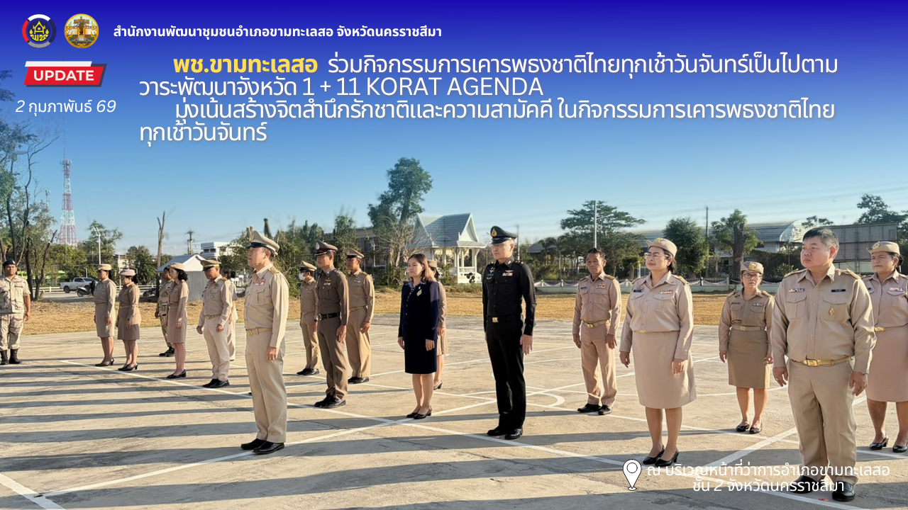 พช. ขามทะเลสอ ร่วมกิจกรรมการเคารพธงชาติไทยทุกเช้าวันจันทร์เป็นไปตามวาระพัฒนาจังหวัด 1 + 11 KORAT AGENDA