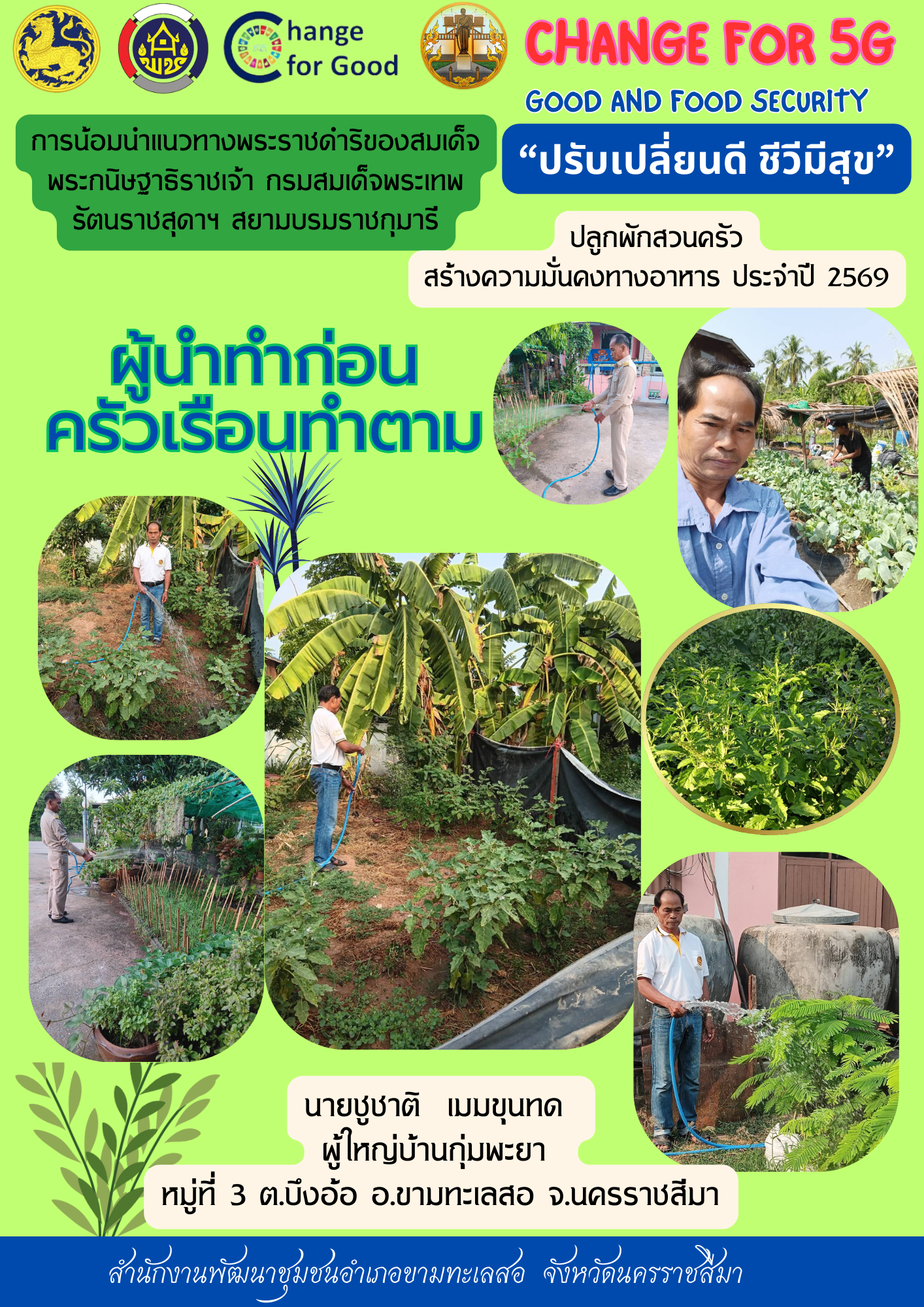 สำนักงานพัฒนาชุมชนอำเภอขามทะเลสอ ขอเชิญชวนประชาชนร่วมกัน ปลูกผักสวนครัวเพื่อสร้างความมั่นคงทางอาหาร น้อมนำแนวพระราชดำริของ สมเด็จพระกนิษฐาธิราชเจ้า กรมสมเด็จพระเทพรัตนราชสุดาฯ สยามบรมราชกุมารี สู่การปฏิบัติอย่างเป็นรูปธรรม ภายใต้แนวคิด “ปรับเปลี่ยนดี ชีวีตมีสุข (Change for 5G Plus)” และแนวทาง “ผู้นำทำก่อน ครัวเรือนทำตาม (GOOD & FOOD SECURITY)” เพื่อยกระดับคุณภาพชีวิตและเสริมสร้างความมั่นคงทางอาหารให้แก่ประชาชนในชุมชนการขับเคลื่อนกิจกรรมดังกล่าว นำโดย นายชูชาติ เมฆขุนทด ผู้ใหญ่บ้านกุ่มพะยา ม.3 และนายเกียรติศักดิ์ วงศ์วิไลย์ ผู้ใหญ่บ้านหนองกระโดน ม.5 ต.บึงอ้อ จังหวัดนครราชสีมา ร่วมกันปลูกผักสวนครัวเพื่อสร้างคลังอาหารตั้งแต่ระดับครัวเรือน ชุมชน และท้องถิ่น ควบคู่กับการปลูกฝังวัฒนธรรมการแบ่งปัน