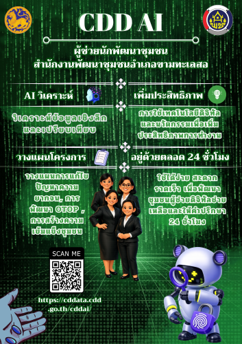 CDD AI คือ เว็บไซต์และแพลตฟอร์มผู้ช่วยพัฒนากรที่ใช้เทคโนโลยีปัญญาประดิษฐ์ (AI) รวบรวมข้อมูล เครื่องมือ และสารสนเทศสำคัญด้านการพัฒนาชุมชนไว้ในที่เดียว ช่วยให้พัฒนากร ผู้บริหารและประชาชนเข้าถึงข้อมูลที่จำเป็นได้ง่ายขึ้น พร้อมสามารถวิเคราะห์สถานการณ์ชุมชน วางแผนการพัฒนาได้อย่างรวดเร็ว แม่นยำ และมีประสิทธิภาพ